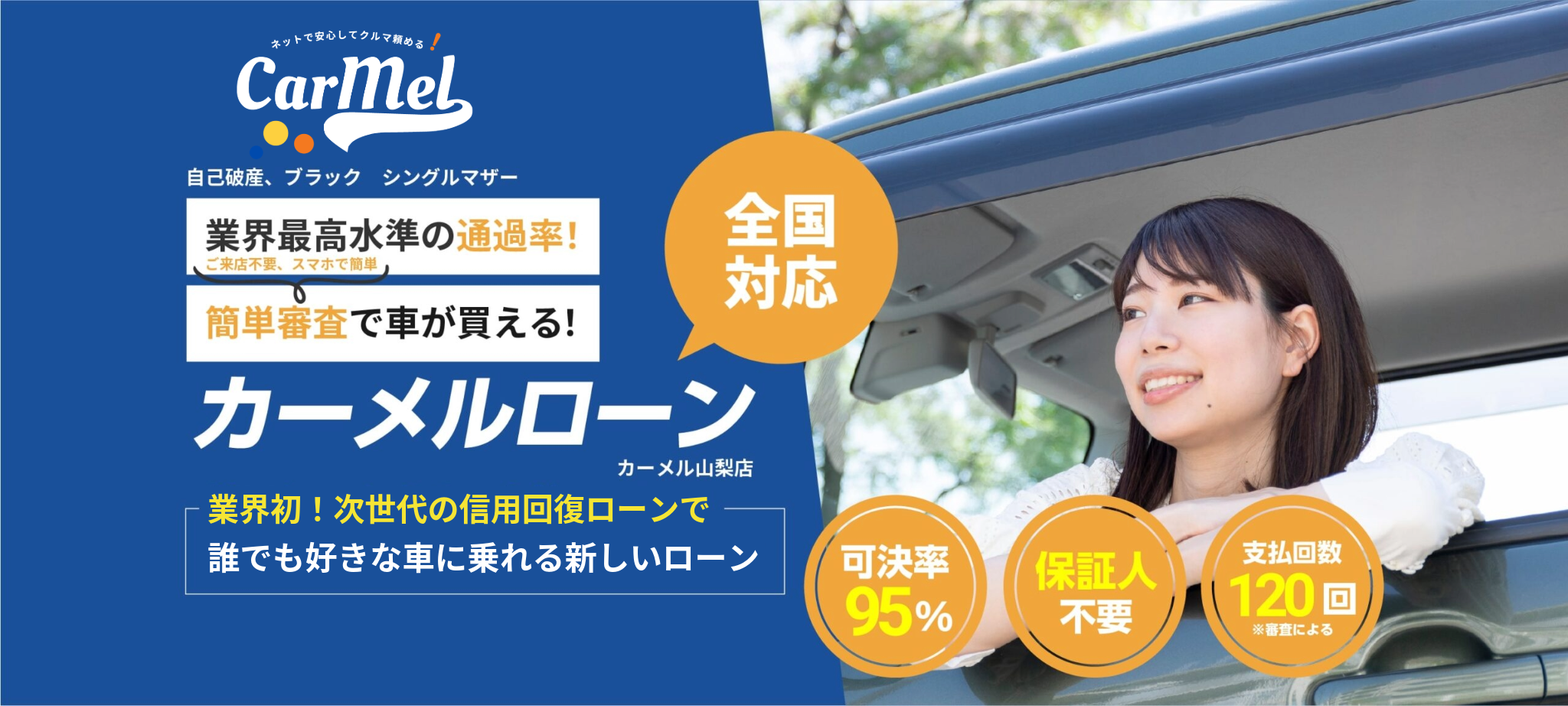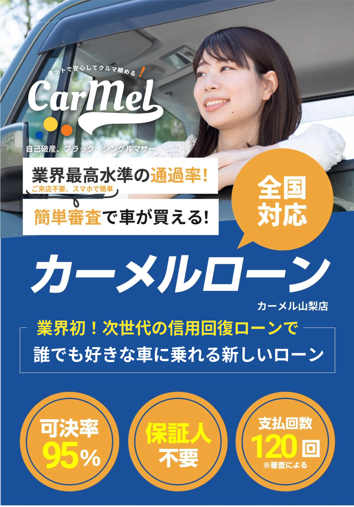 一般的な自社ローンでは車種が選べない事が多い中、カーメルでは与信枠にあった範囲での車選びを柔軟にしました。審査の通過率としても次世代のオートローンでは80%以上の確率でお取り組み頂いてるかたがほとんどです。様々な事情があっても今現在がしっかり収入があり、支払い能力がありましたら問題なく審査可能です。